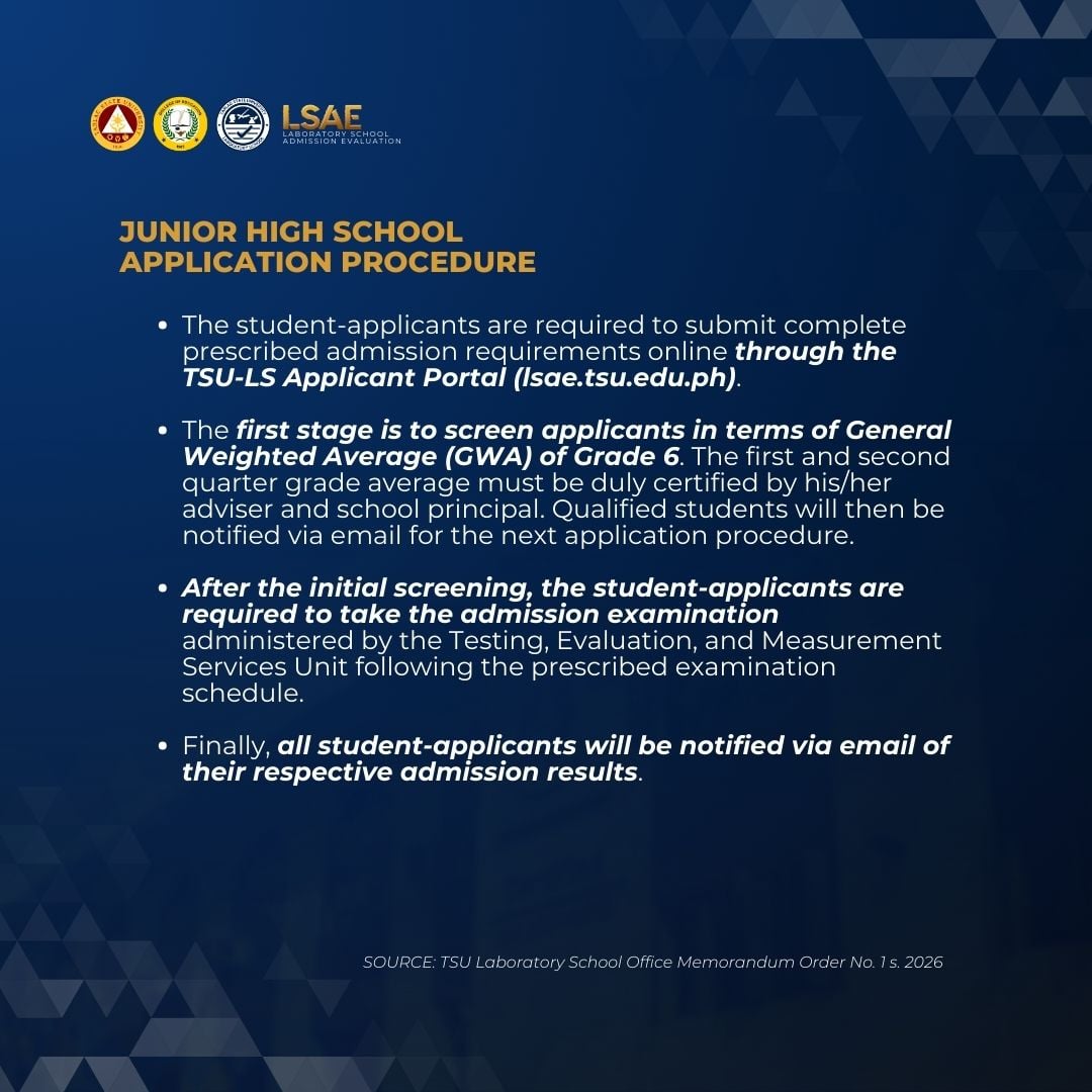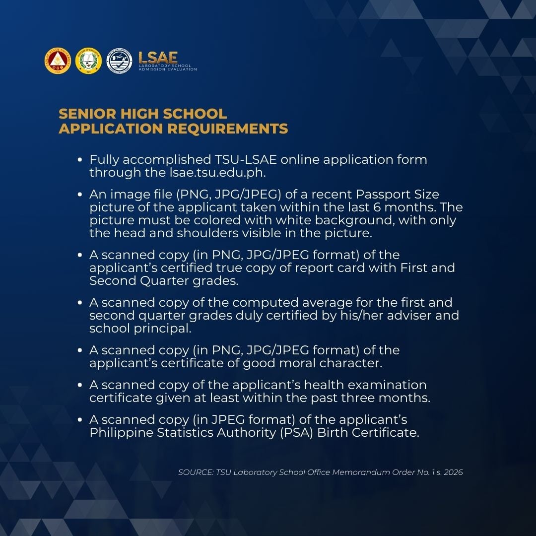 The online application for the Tarlac State University-Laboratory School Admission Evaluation (TSU-LSAE) will be open beginning February 1, 2026 (Sunday) until February 28, 2026 (Saturday).