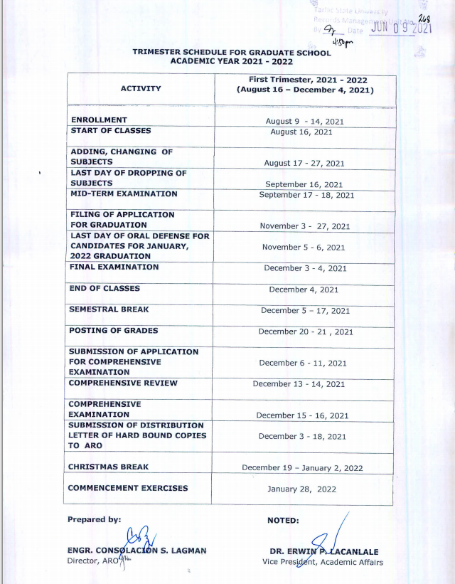 Collegiate Academic Calendar (First Semester, AY 2021-2022) and Graduate School Schedule (First Trimester, AY 2021-2022)