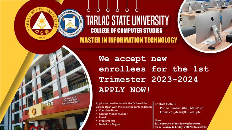 The TSU Master in Information Technology program under the College of Computer Studies is accepting new enrollees for the 1st Trimester, A.Y. 2023-2024.