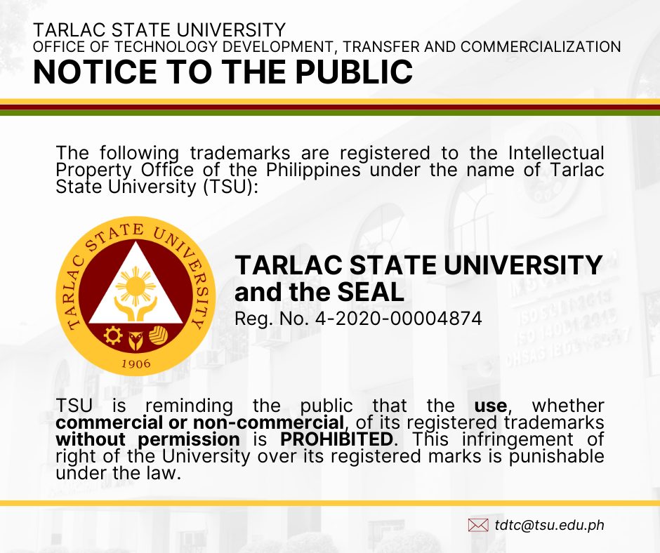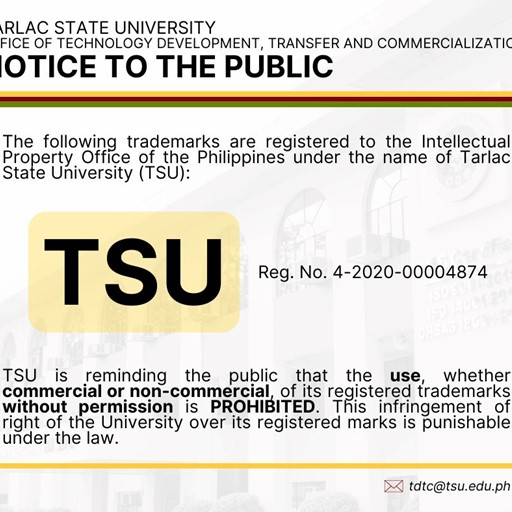 The following trademarks are registered to the Intellectual Property Office of the Philippines under the name of TARLAC STATE UNIVERSITY (TSU)