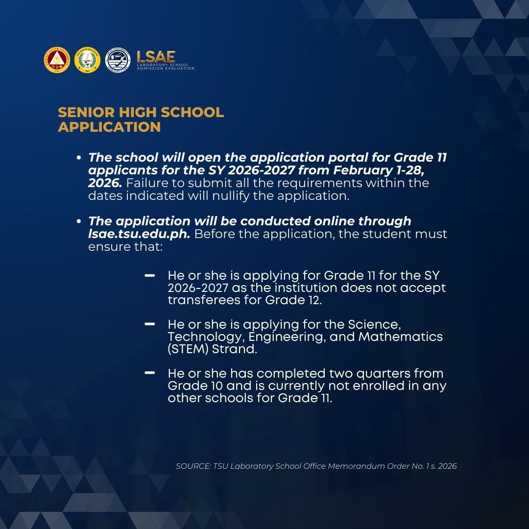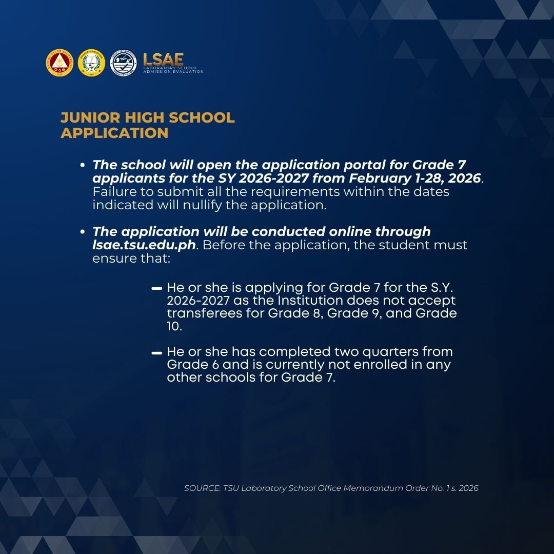 The online application for the Tarlac State University-Laboratory School Admission Evaluation (TSU-LSAE) will be open beginning February 1, 2026 (Sunday) until February 28, 2026 (Saturday).