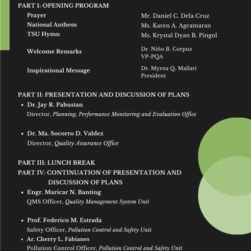 The Tarlac State University (TSU) Vice President for Planning and Quality Assurance office successfully conducted its Strategic Planning-Workshop for 2021-2022 at the NSTP Function Hall, Lucinda Extension Campus on March 19, 2021 with the theme, Esprit the Corps Amidst the Pandemic. Directors, unite heads and staff under the VPPPQAO attended the said event and shared their plans and targets for 2021-2022.