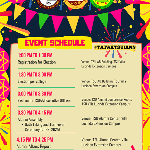 In line with the 116th foundation and 33rd charter anniversary of our beloved university, the Tarlac State University Alumni Association Inc. has prepared festive activities that the alumni will enjoy in-person and virtually!